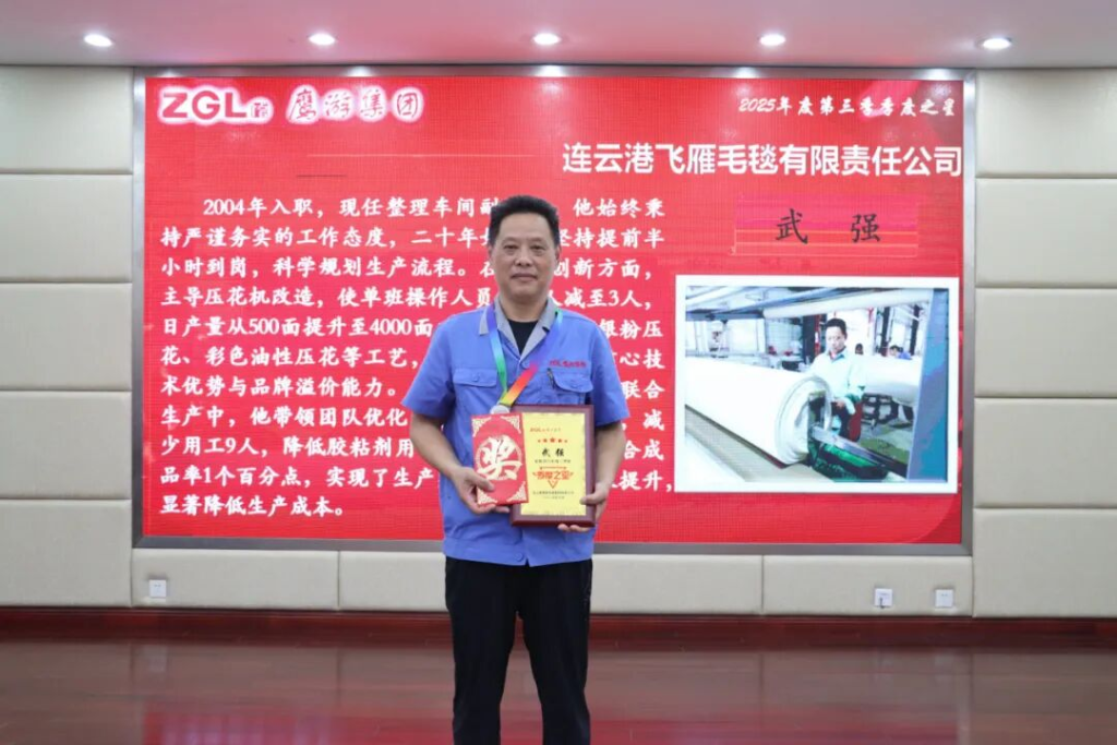 武强,自2004年加入飞雁毛毯公司以来,从基层新产品抬板压花工逐步成长为整理车间副主任。他始终秉持严谨务实的工作态度,二十年如一日坚持提前半小时到岗,科学规划生产流程。在技术创新方面,主导机器改造和工艺改革,有效提升了企业核心技术优势与品牌溢价能力,实现了生产效率与产品质量双提升,显著降低生产成本。为此荣获先进工作者、技术管理创新之星、科学技术进步奖等多项荣誉。